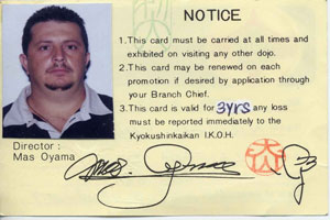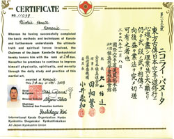 Deoarece eram strain si nu vorbeam bine engleza tot timpul ma ajuta sa-mi rezolv orice problema, pot sa zic cu mana pe inima ca in America cei din dojo Kanamura au fost singurul loc in care m-am simtit ca intr-o familie. In anul 2005 am sustinut examenul de shodan, comisia de examinarea a fost formata din shihan Kanamura 8 Dan si 3 centuri negre de 4 Dan, perioada de pregatire a fost de 4 luni, slabisem datorita antrenamentelor si caldurii din Florida 12 kg imi doream enorm de mult sa nu dezamagesc pe cineva si mai ales pe mine, a fost visul meu ca examenul de prima centura neagra sa-l dau cu un japonez, vis care mi sa implinit, tot in 2005 dupa ce am obtinut shodanul am aderat la Federatia Internationala din care fac si acum parte ca operator dojo - All Japan Kyokushin Union, care intre timp s-a transformat in una din cele mai mari prolifice organizatii mondiale de karate kyokushin din lume "Internationale Karate Organization Kyokushinkaikan Union".